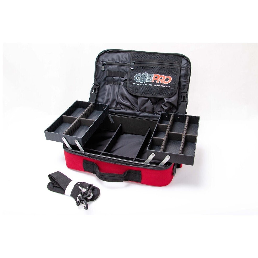 Carry-on mobile station with patented extending tray system, modular interior, crossbody strap, and water resistant build. Ideal for jobs near or far. Transforms into a workstation in seconds.